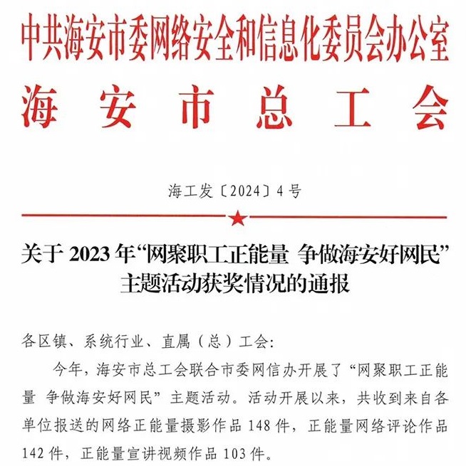 近日,海安市總工會(huì)聯(lián)合市委網(wǎng)信辦舉辦的“網(wǎng)聚職工正能量 爭(zhēng)做海安好網(wǎng)民”主題活動(dòng)公布了獲獎(jiǎng)名單。城建集團(tuán)園林綠化公司陳閃,演講視頻作品《新時(shí)代征程上的城建人》,榮獲正能量宣講視頻一等獎(jiǎng)。城建集團(tuán)綜合管理部王菲菲,作品《不負(fù)“熱”愛(ài)!——高溫里的堅(jiān)守 烈陽(yáng)下的擔(dān)當(dāng)》,榮獲網(wǎng)絡(luò)正能量攝影作品二等獎(jiǎng)。城建集團(tuán)綜合管理部葛愛(ài)藝,作品《你是城市里最美的風(fēng)景》,榮獲網(wǎng)絡(luò)正能量攝影作品三等獎(jiǎng)。城建集團(tuán)水務(wù)公司朱