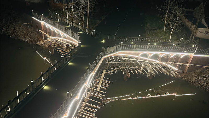 海安隆政街道海北老區(qū)有這么一座造型獨特,寫滿鄉(xiāng)情水韻的標志性橋梁——三角橋。相較于其他橋梁,三角橋設計極為精巧別致。該橋位于隆政街道海北村8組,橫跨兩河連接三地,溝通連接了當時海北政治中心地區(qū)的商貿(mào)文化,距今已有半個世紀的歷史。本次修繕,修舊如舊,最大程度恢復原來的面貌,并新增了亮化,其中亮化工程由城建集團公共事業(yè)公司輝海照明組織施工。這座造型獨特、寫滿鄉(xiāng)情的三角橋見證了歲月流逝,時代變遷,承載著